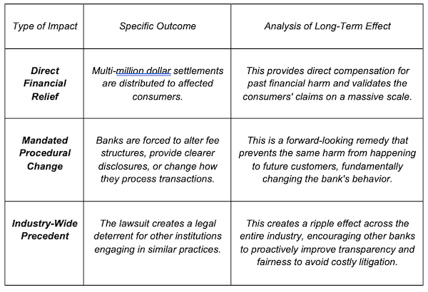 The ripple effects of a successful class action lawsuit over banking fees extend far beyond the individual settlement amounts. These cases have proven to be a powerful catalyst for systemic change within the financial industry.